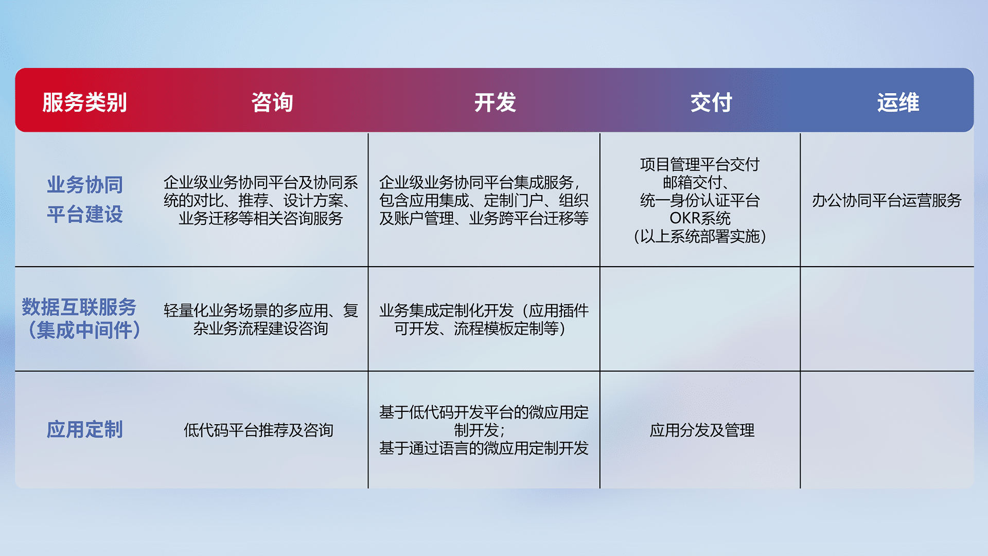 针对钉钉、、、、企微、、、、IDaas等平台级产品提供产品的规划、、方案、、、交付、、定制化开发等服务,,,实现如统一协同办公、、、、智能客户服务、、混合会议管理、、、智能数据查询、、等业务场景,,实现数字化转型。。